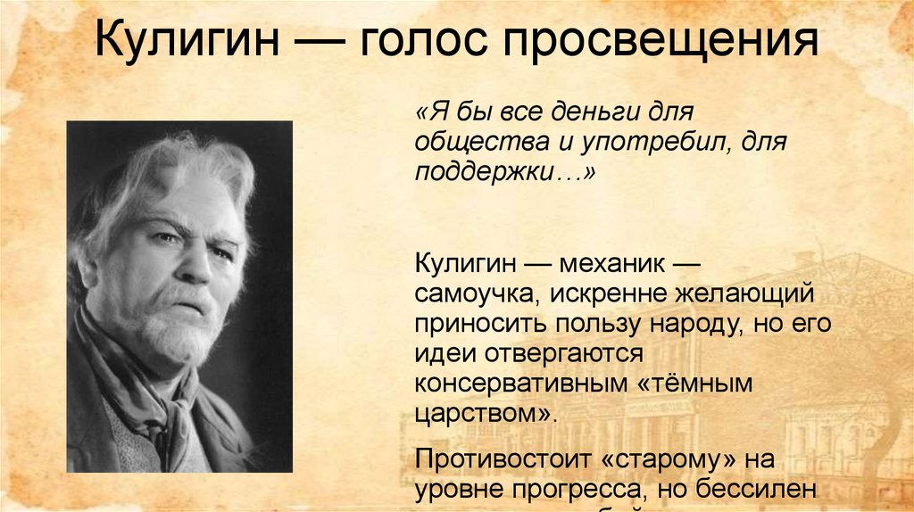 Кулигин — голос просвещения«Я бы все деньги для