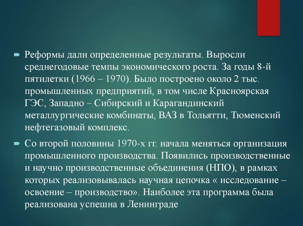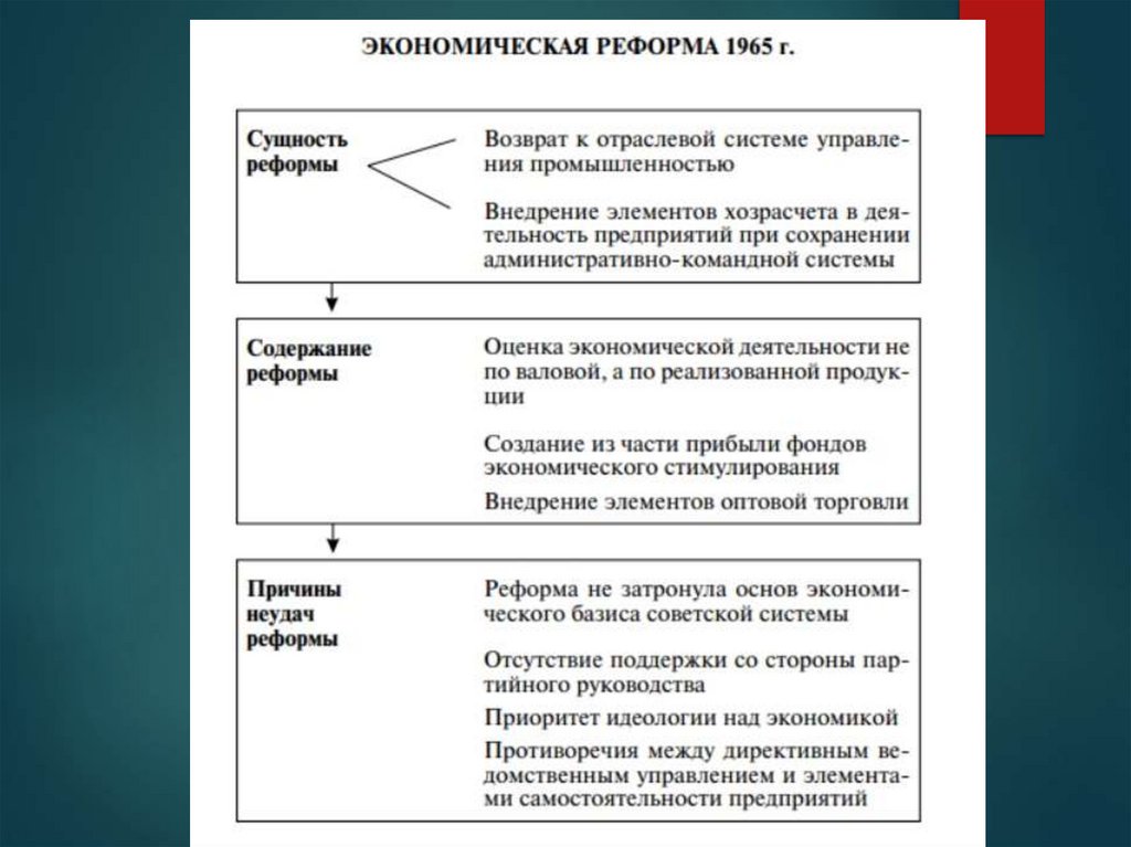 В сентябре 1965 года началась реформа в промышленности,пытающаяся соединить совершенствование хозяйственного