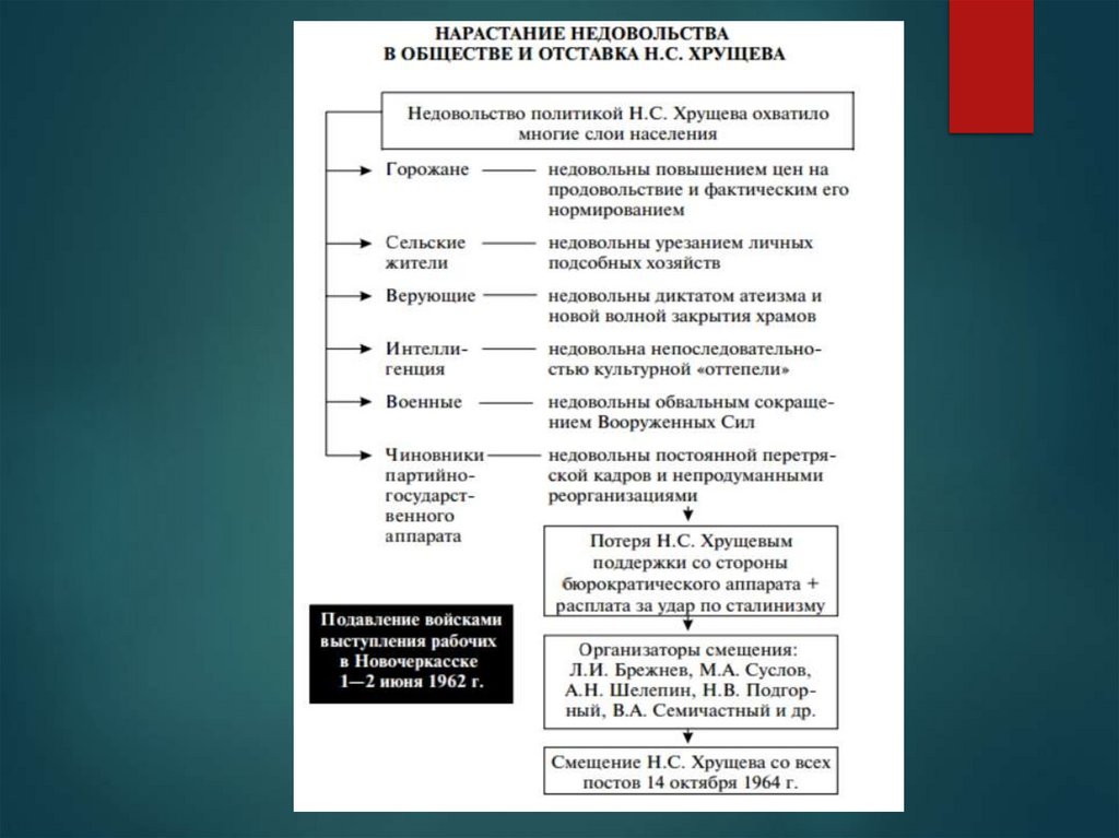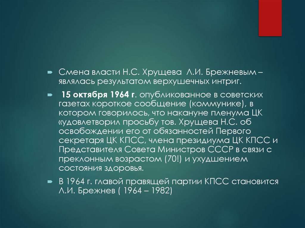 Смена власти Н.С. Хрущева Л.И. Брежневым –являлась результатом верхушечных интриг.