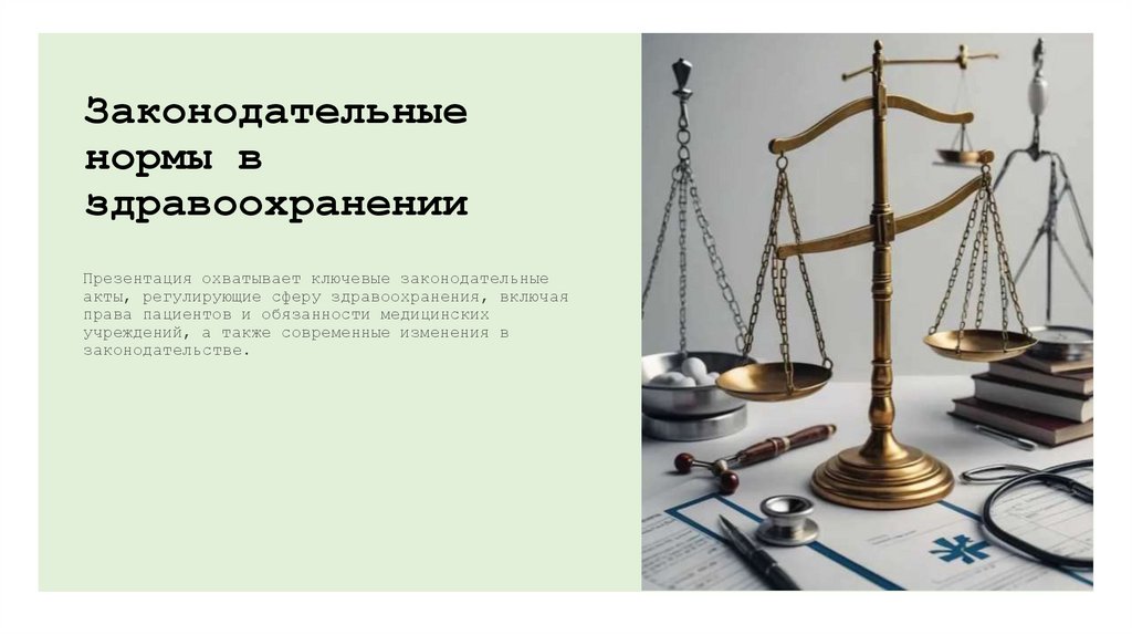 Презентация охватывает ключевые законодательныеакты, регулирующие сферу здравоохранения, включая