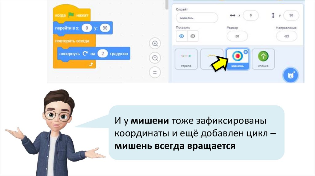 И у мишени тоже зафиксированыкоординаты и ещё добавлен цикл –