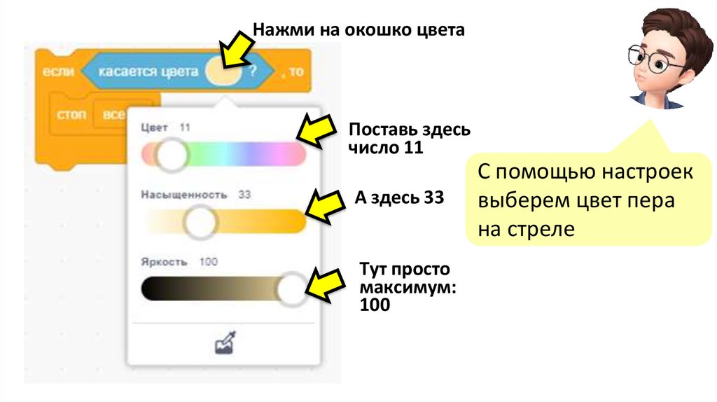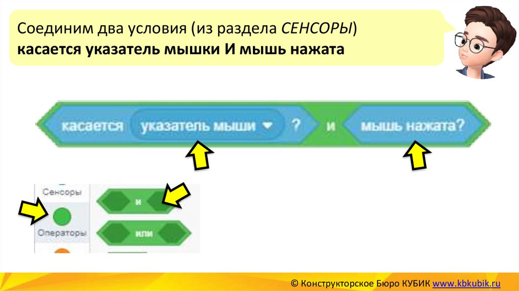 Соединим два условия (из раздела СЕНСОРЫ)касается указатель мышки И мышь нажата