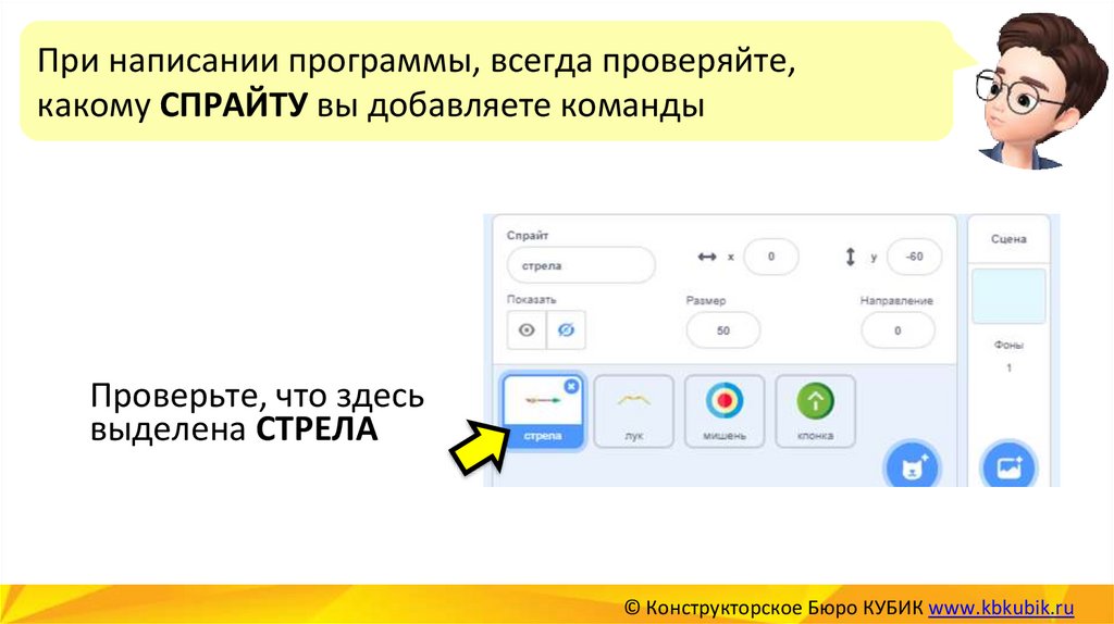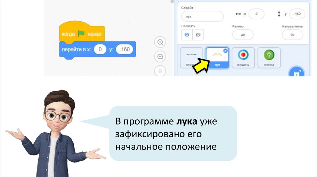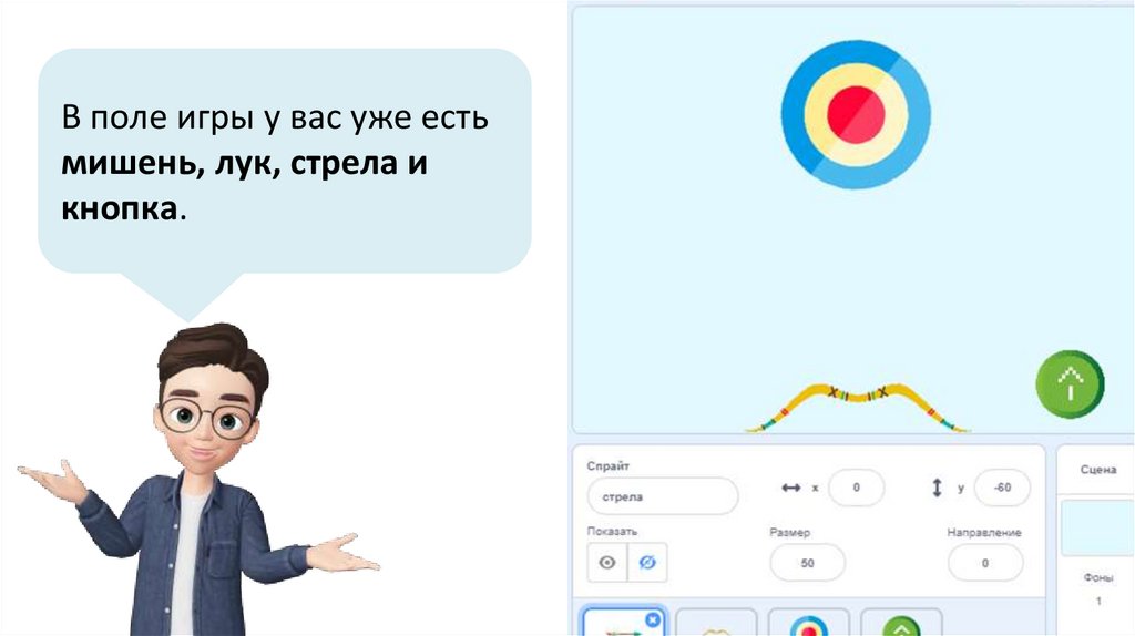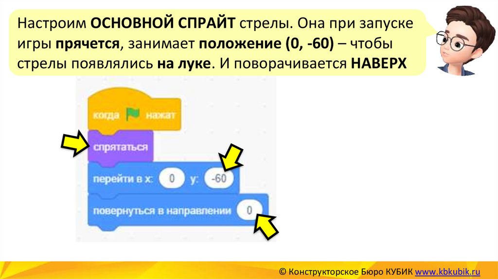 Настроим ОСНОВНОЙ СПРАЙТ стрелы. Она при запускеигры прячется, занимает положение (0, -60) – чтобы
