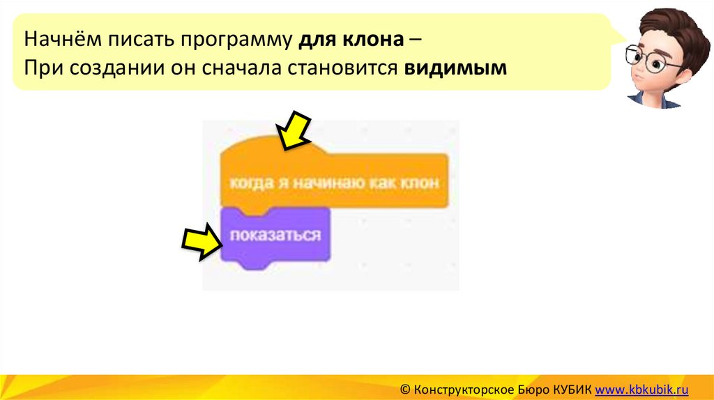 Начнём писать программу для клона –При создании он сначала становится видимым