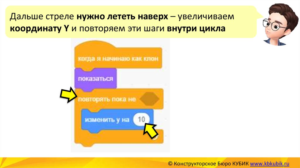 Дальше стреле нужно лететь наверх – увеличиваемкоординату Y и повторяем эти шаги внутри цикла