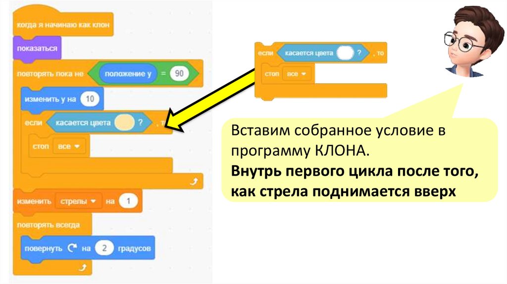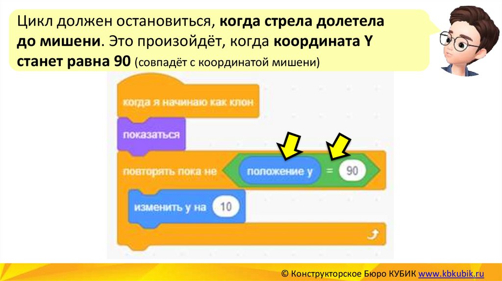 Цикл должен остановиться, когда стрела долетеладо мишени. Это произойдёт, когда координата Y