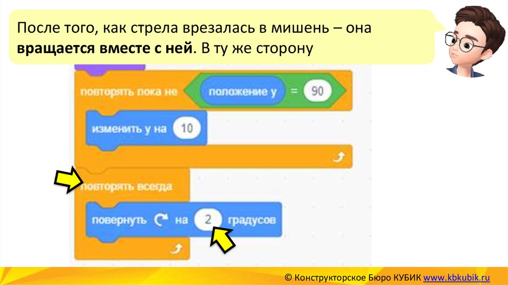 После того, как стрела врезалась в мишень – онавращается вместе с ней. В ту же сторону