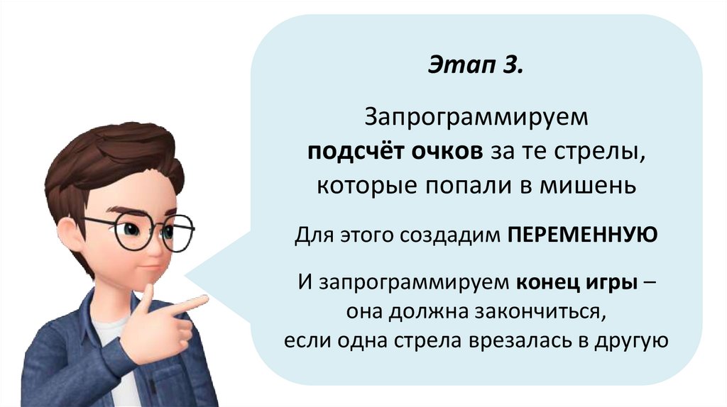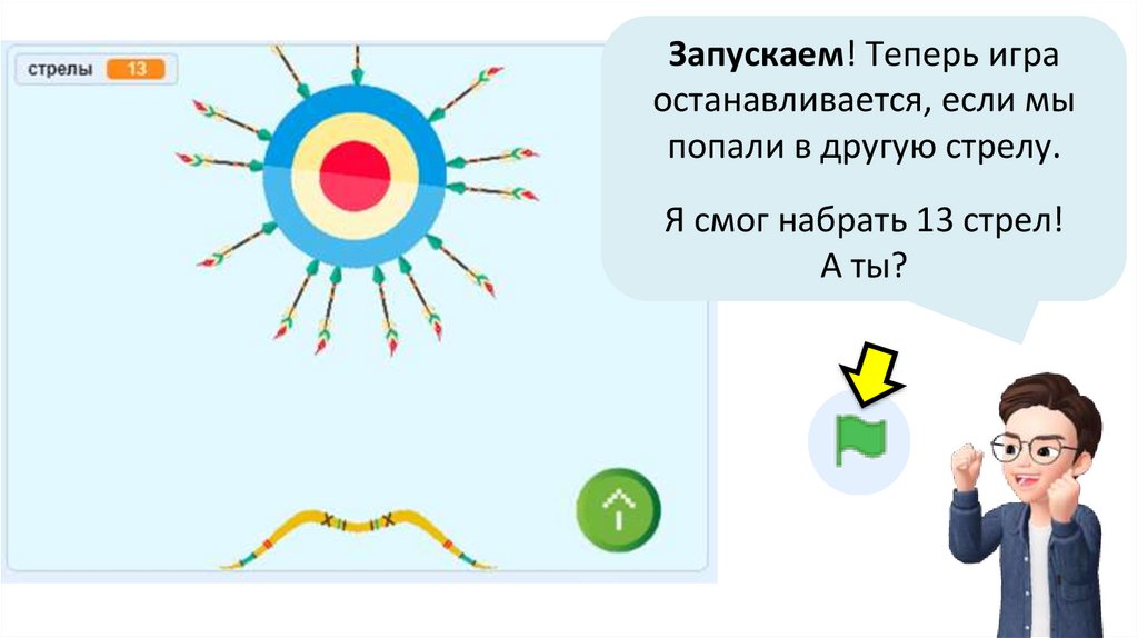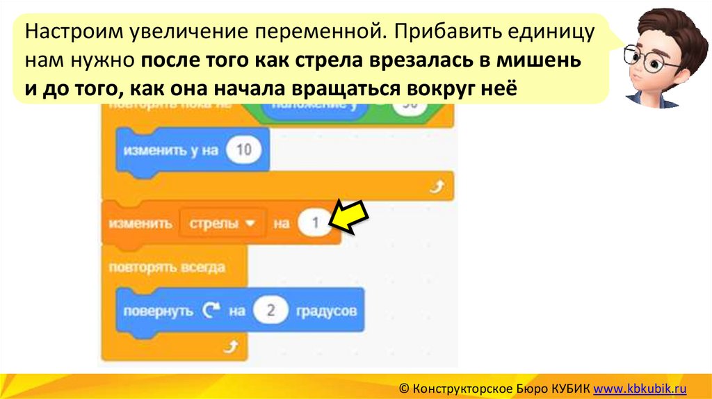Настроим увеличение переменной. Прибавить единицунам нужно после того как стрела врезалась в мишень