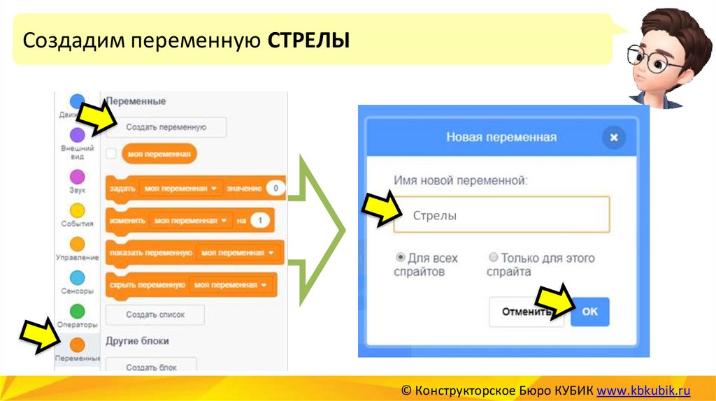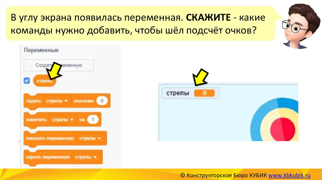 В углу экрана появилась переменная. СКАЖИТЕ - какиекоманды нужно добавить, чтобы шёл подсчёт очков?