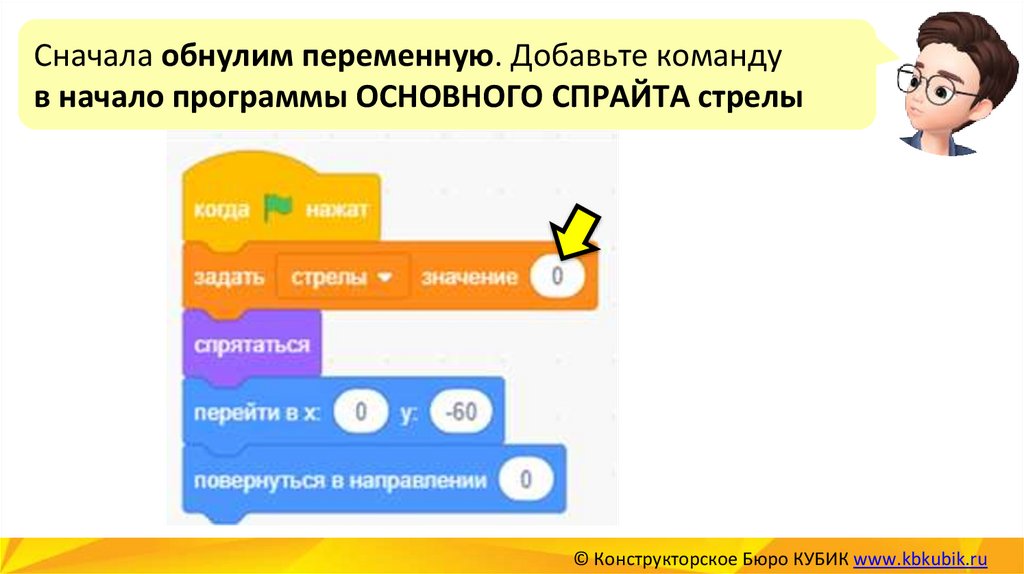 Сначала обнулим переменную. Добавьте командув начало программы ОСНОВНОГО СПРАЙТА стрелы