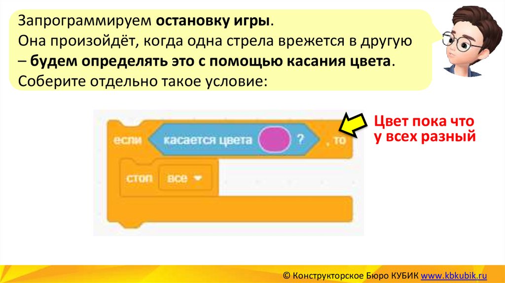 Запрограммируем остановку игры.Она произойдёт, когда одна стрела врежется в другую