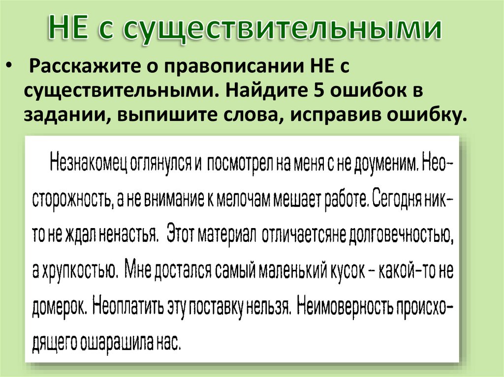 • Расскажите о правописании НЕ ссуществительными. Найдите 5 ошибок в