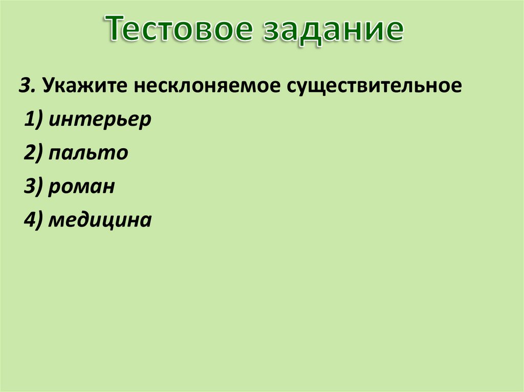 3. Укажите несклоняемое существительное1) интерьер
