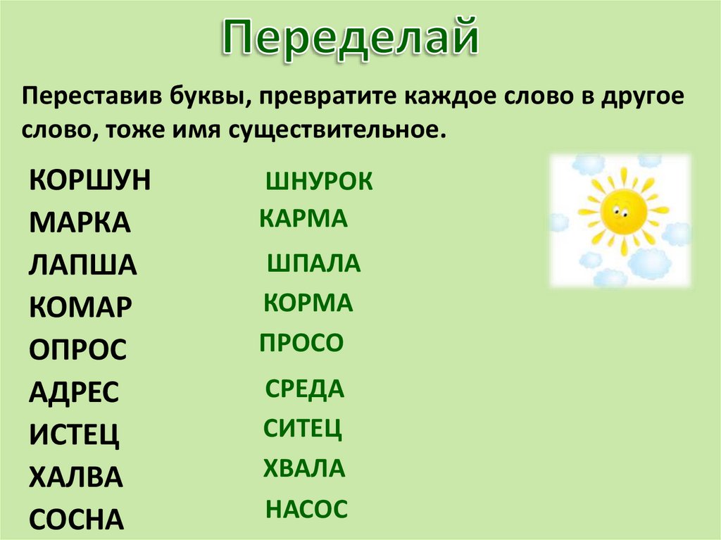Переставив буквы, превратите каждое слово в другоеслово, тоже имя существительное.