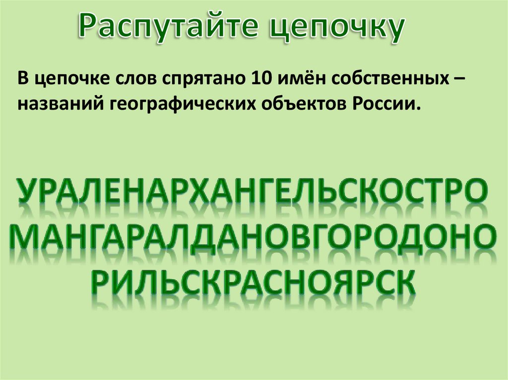 В цепочке слов спрятано 10 имён собственных –названий географических объектов России.