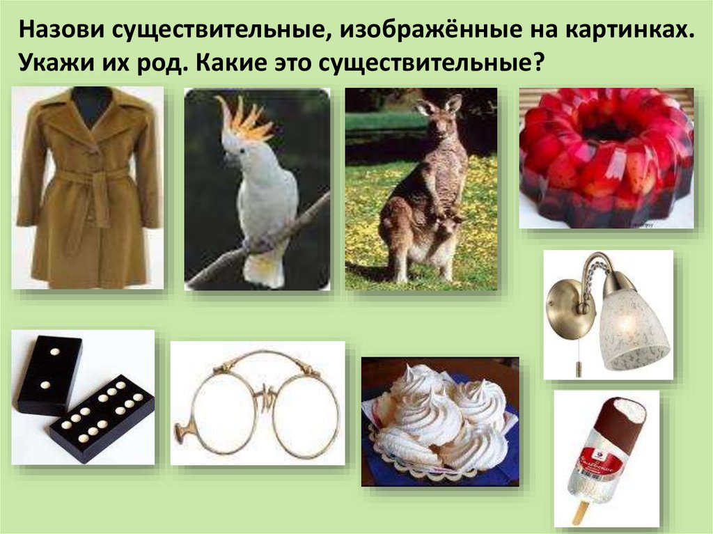 Назови существительные, изображённые на картинках.Укажи их род. Какие это существительные?