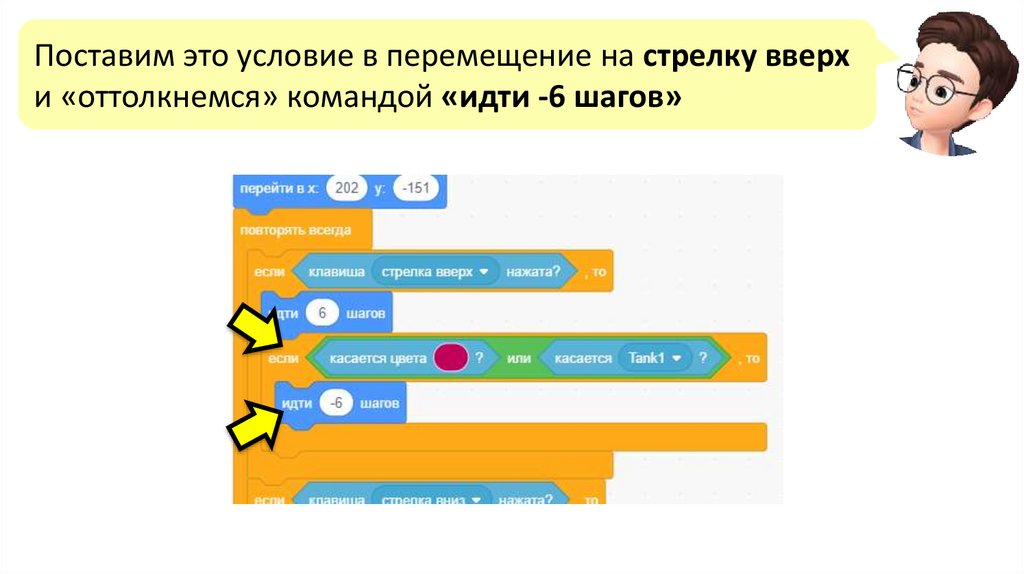 Поставим это условие в перемещение на стрелку вверхи «оттолкнемся» командой «идти -6 шагов»
