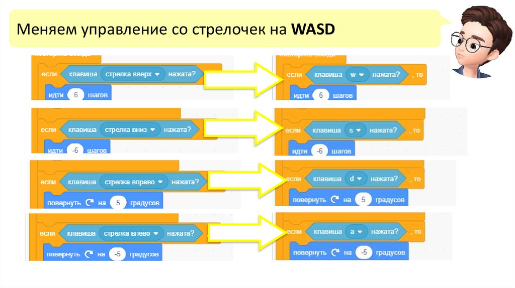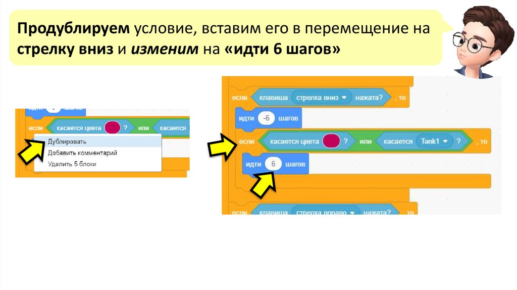 Продублируем условие, вставим его в перемещение настрелку вниз и изменим на «идти 6 шагов»