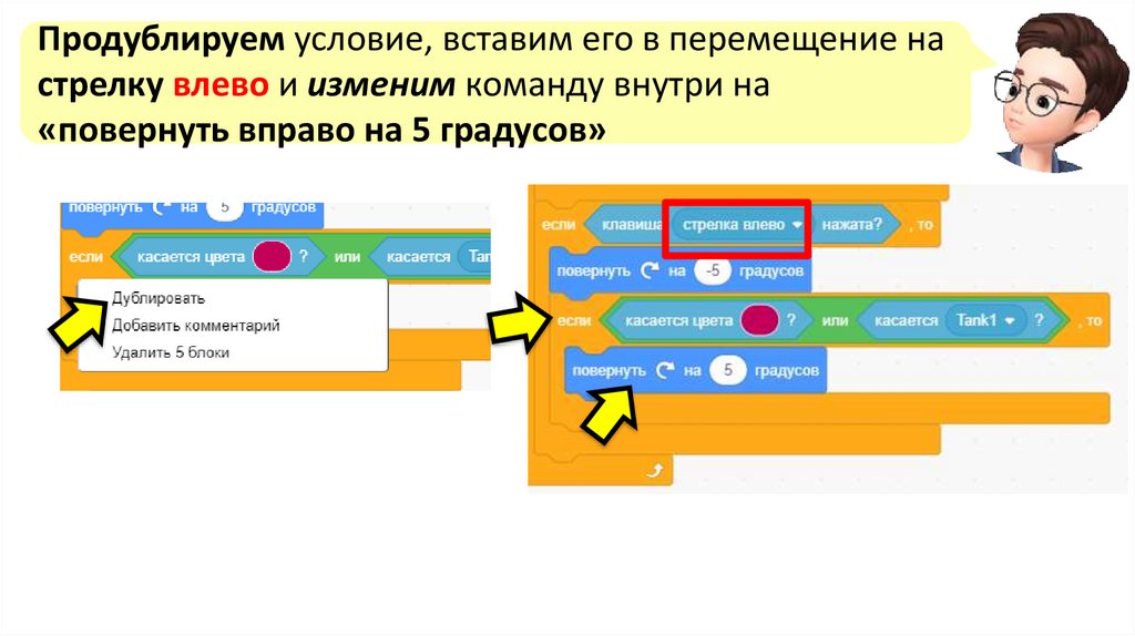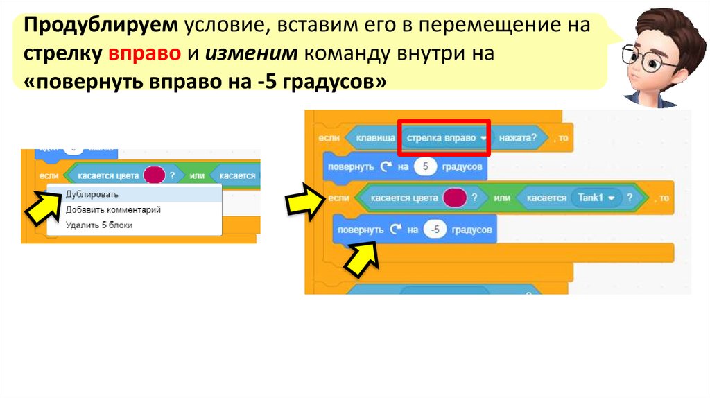Продублируем условие, вставим его в перемещение настрелку вправо и изменим команду внутри на