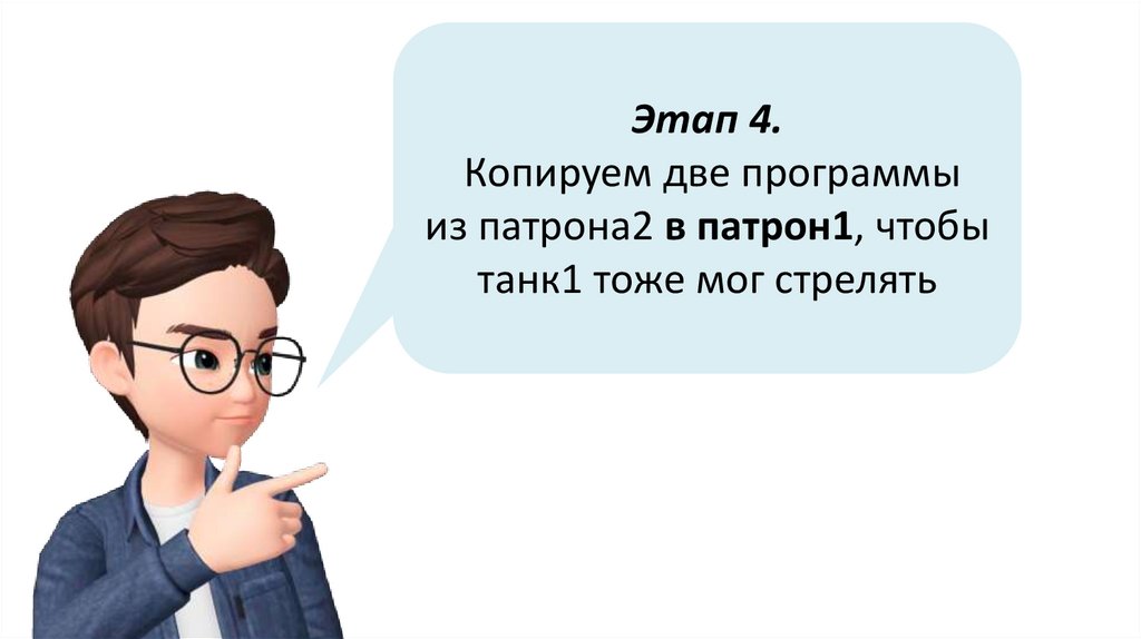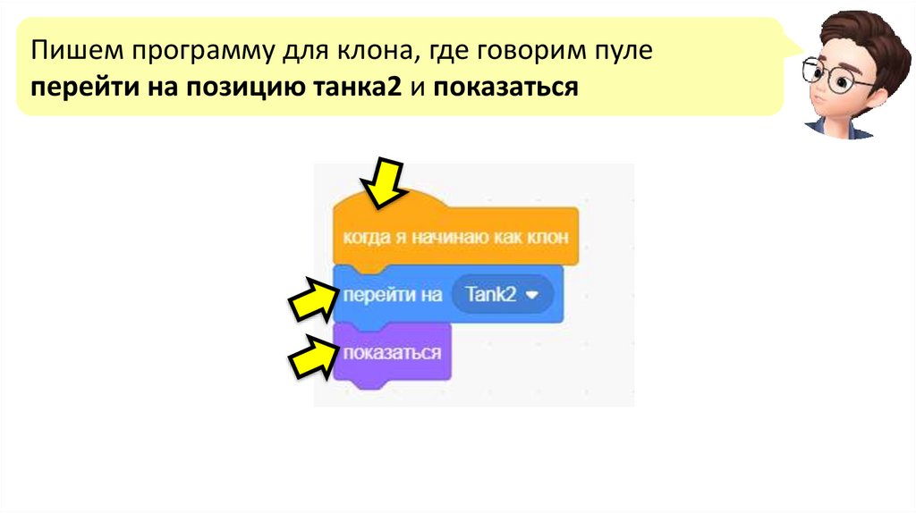 Пишем программу для клона, где говорим пулеперейти на позицию танка2 и показаться