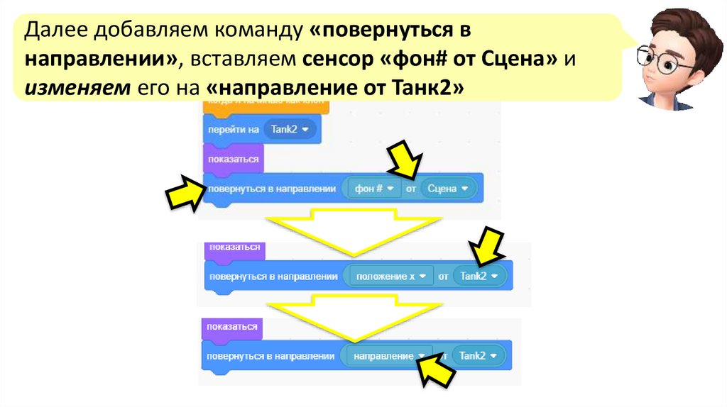 Далее добавляем команду «повернуться внаправлении», вставляем сенсор «фон# от Сцена» и