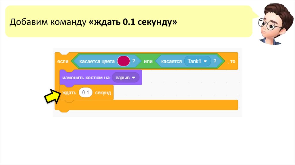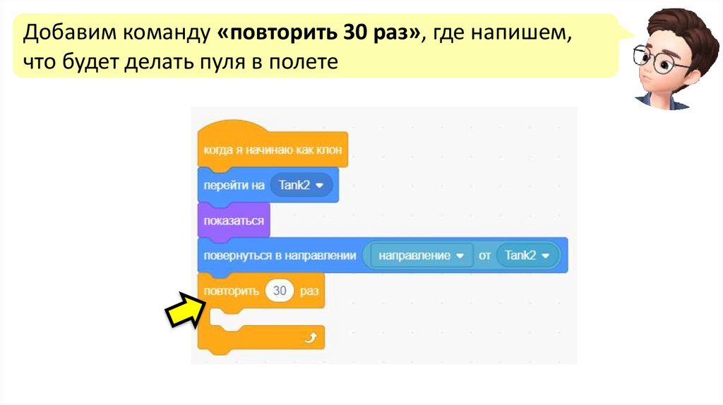 Добавим команду «повторить 30 раз», где напишем,что будет делать пуля в полете