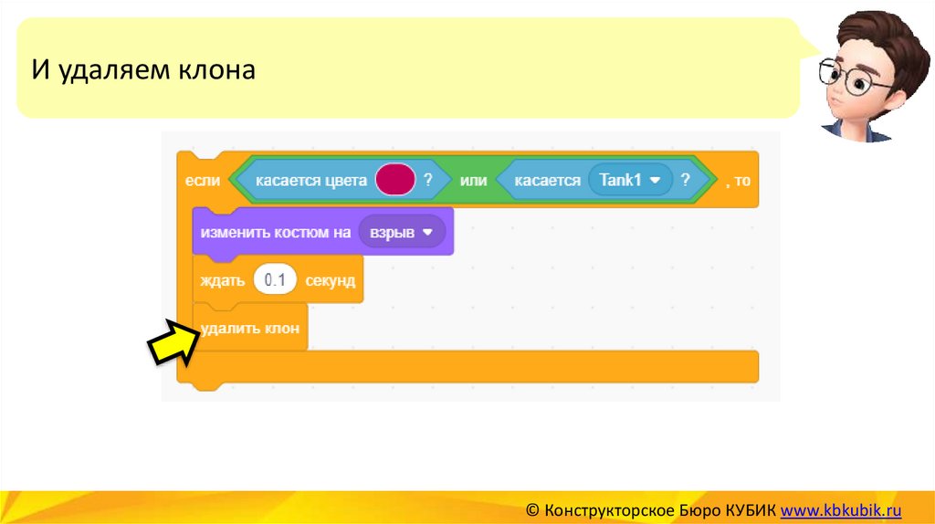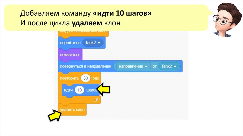 Добавляем команду «идти 10 шагов»И после цикла удаляем клон