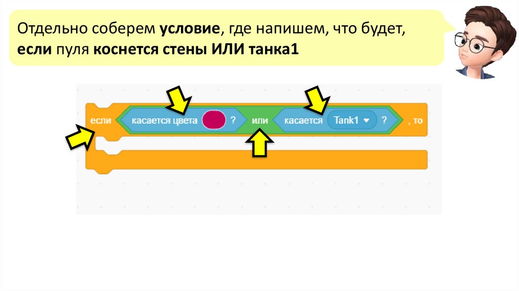 Отдельно соберем условие, где напишем, что будет,если пуля коснется стены ИЛИ танка1