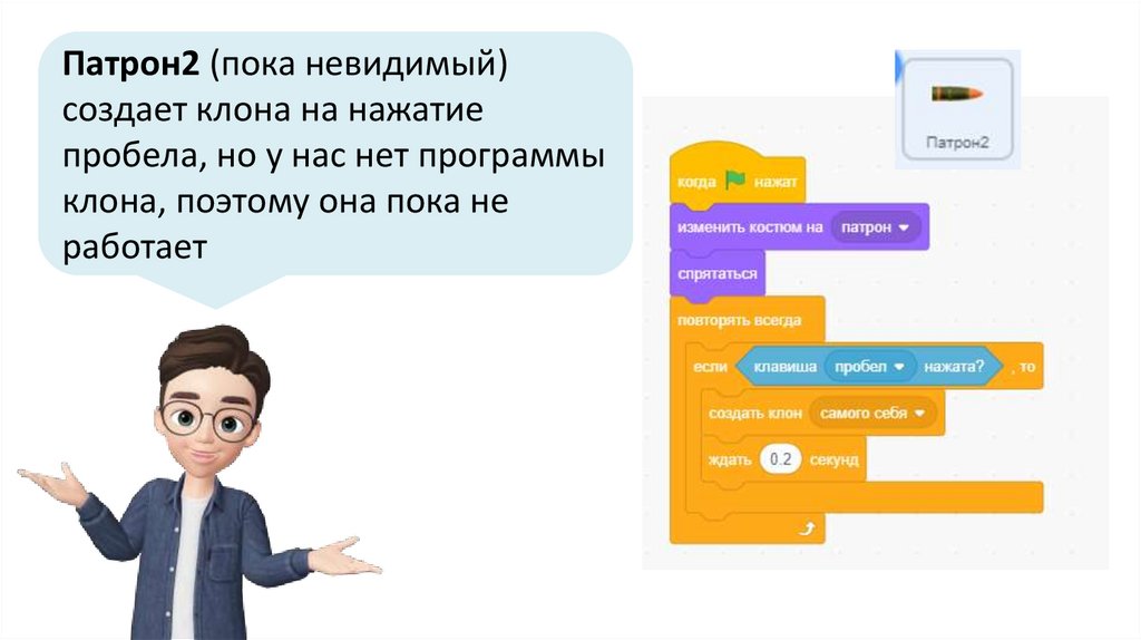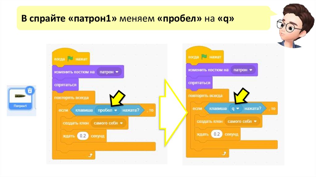 В спрайте «патрон1» меняем «пробел» на «q»38.