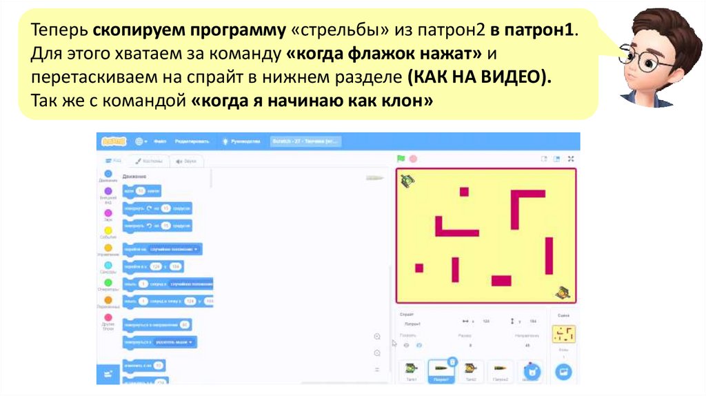 Теперь скопируем программу «стрельбы» из патрон2 в патрон1.Для этого хватаем за команду «когда флажок нажат» и