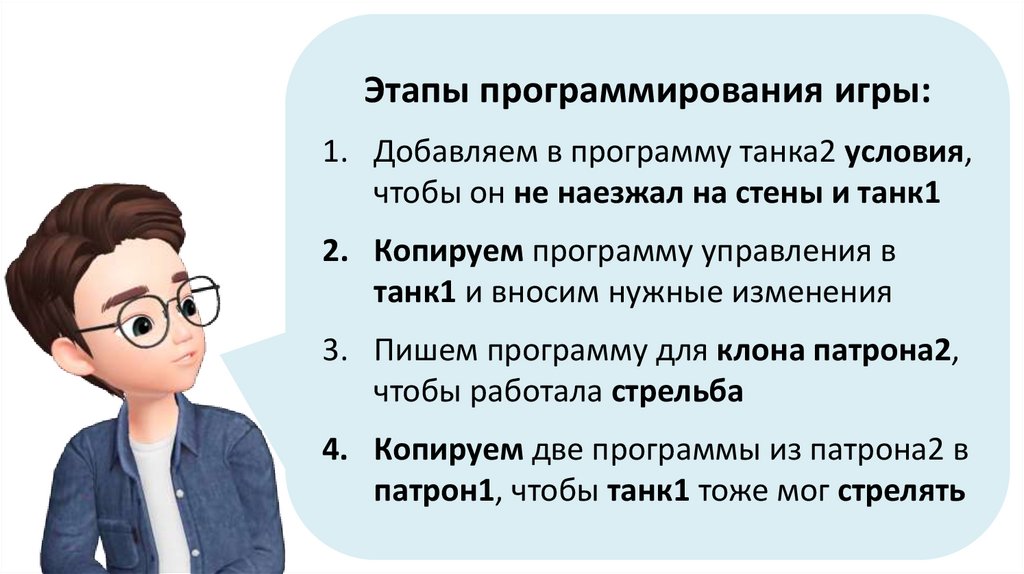Этапы программирования игры:1. Добавляем в программу танка2 условия,