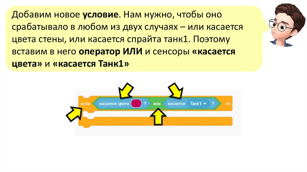 Добавим новое условие. Нам нужно, чтобы оносрабатывало в любом из двух случаях – или касается