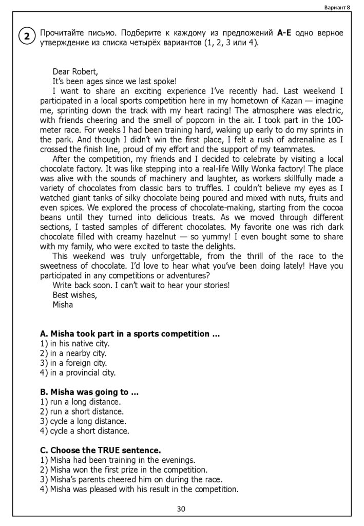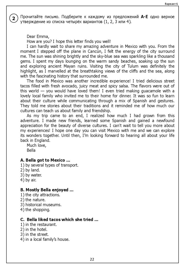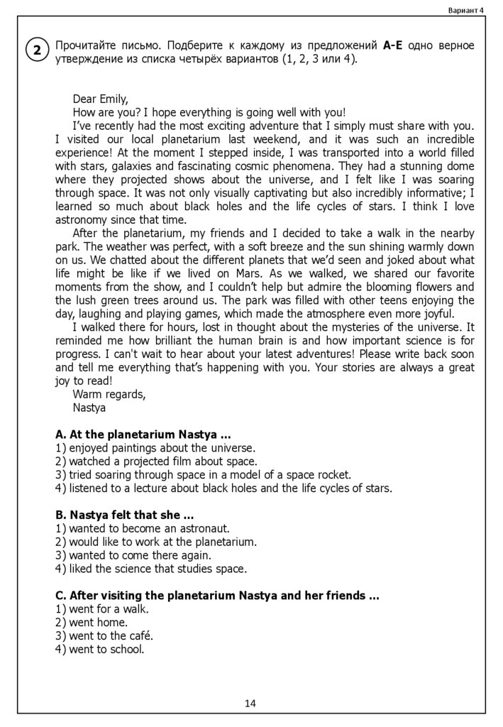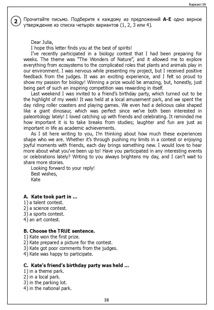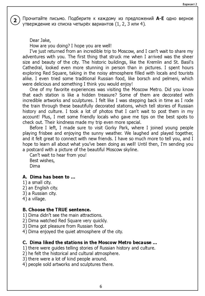 Прочитайте письмо. Подберите к каждому из предложений A-E одно верное