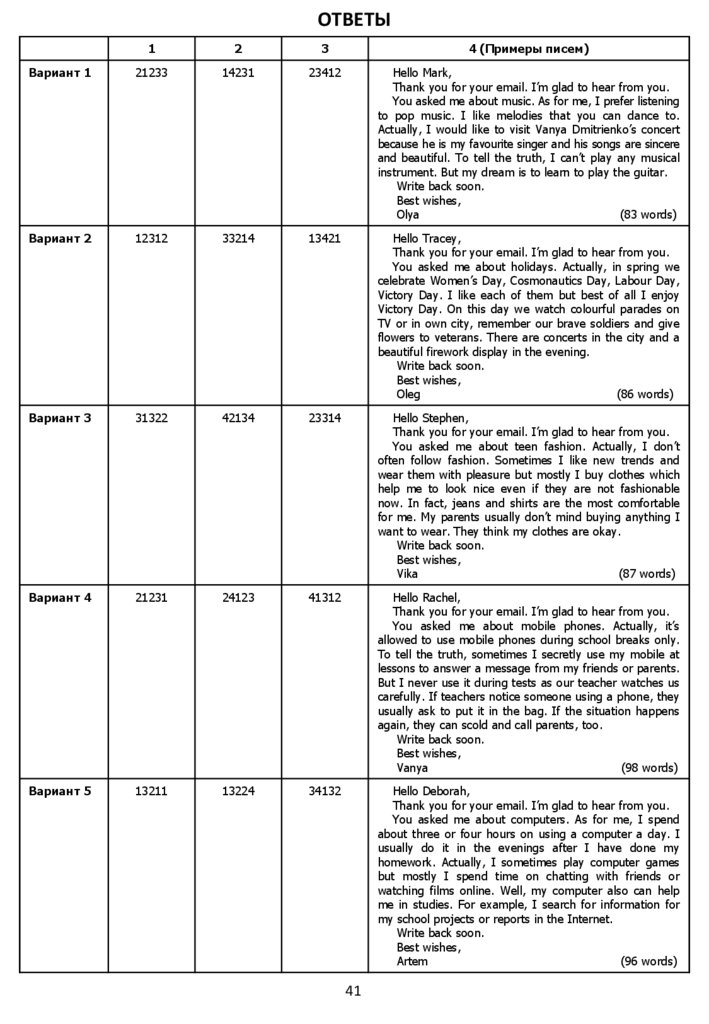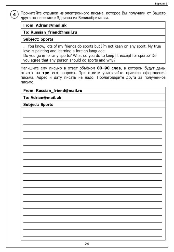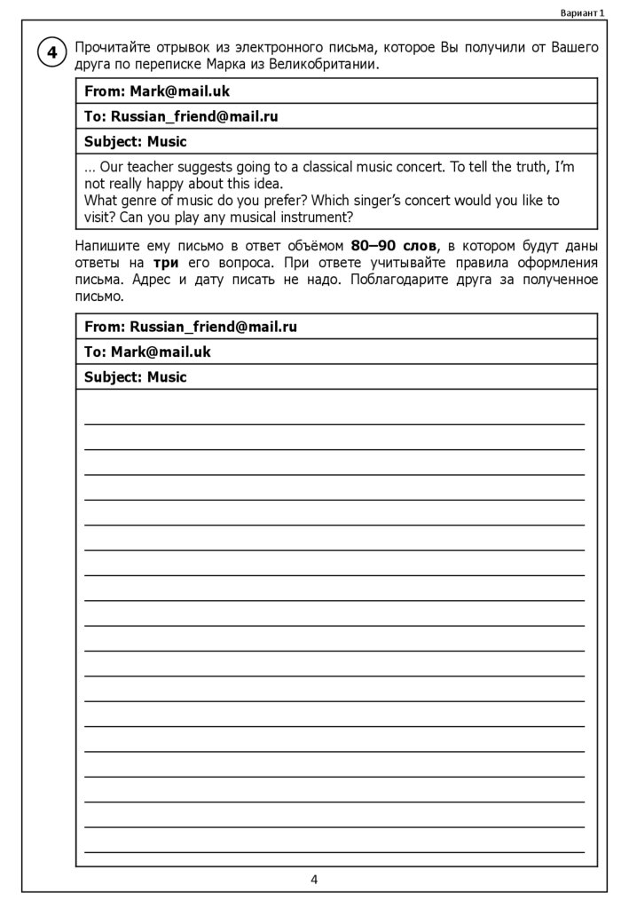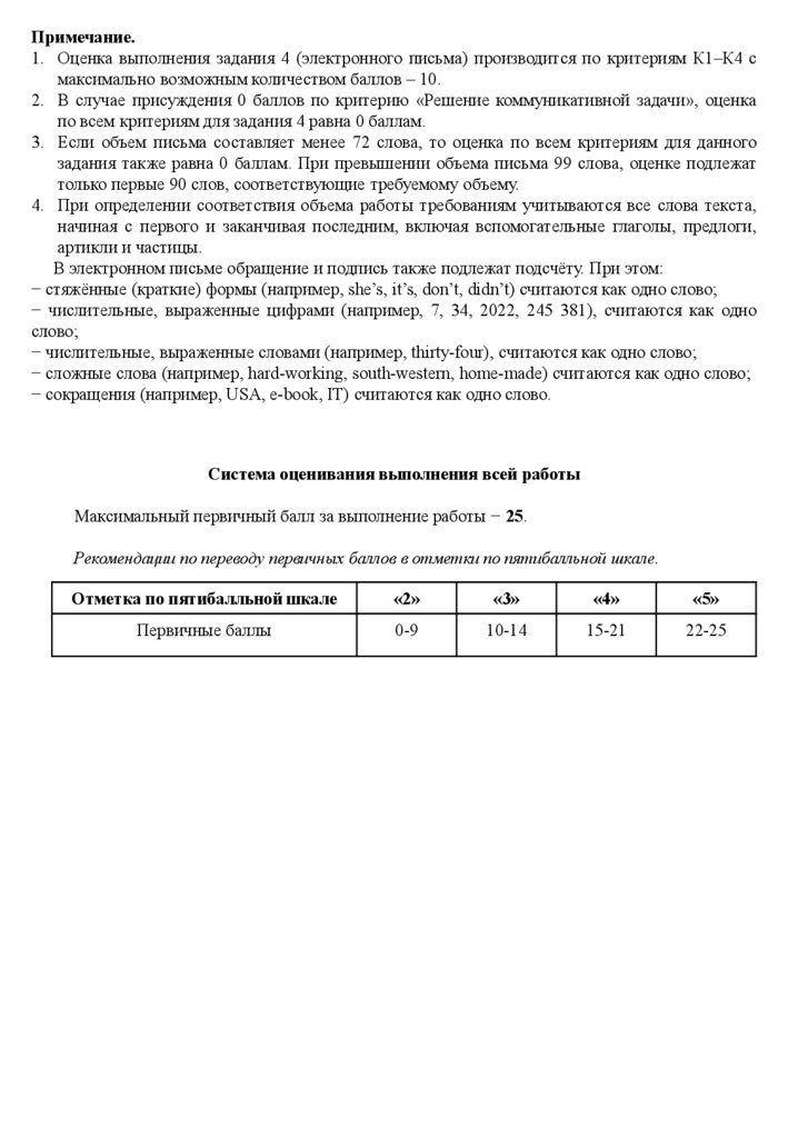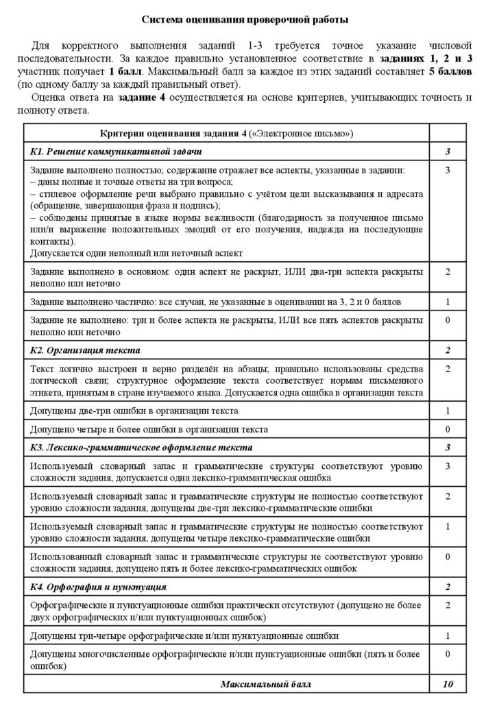 Примечание.1. Оценка выполнения задания 4 (электронного письма) производится по критериям К1–К4 с