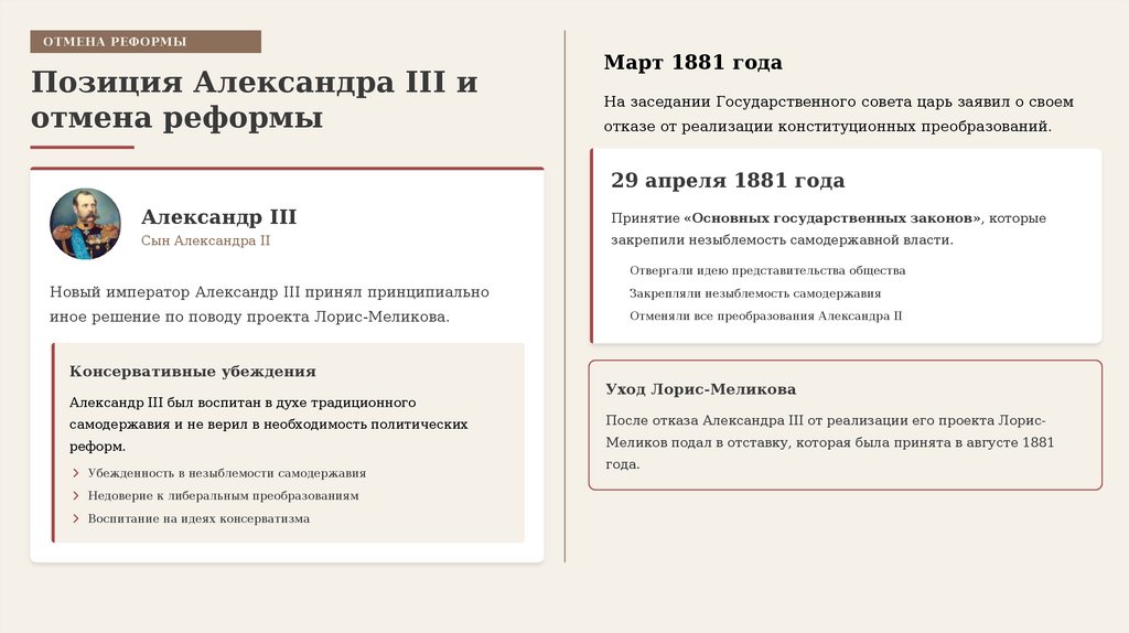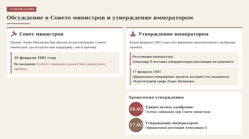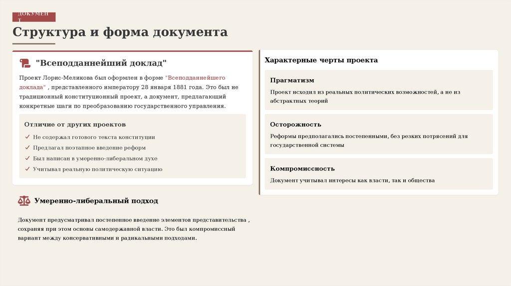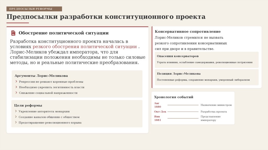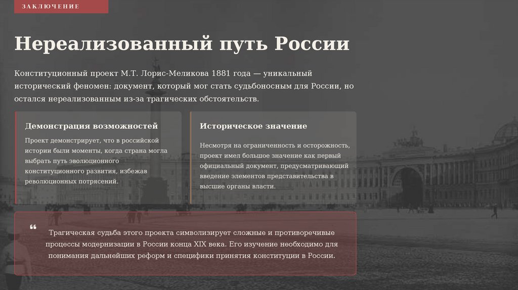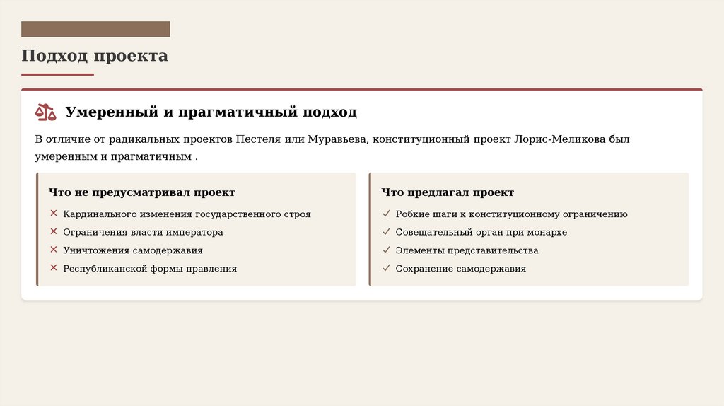 В отличие от радикальных проектов Пестеля или Муравьева, конституционный проект Лорис-Меликова был