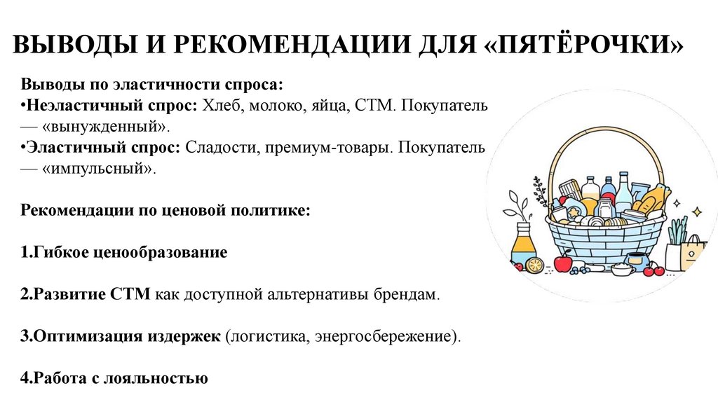 ВЫВОДЫ И РЕКОМЕНДАЦИИ ДЛЯ «ПЯТЁРОЧКИ»Выводы по эластичности спроса: