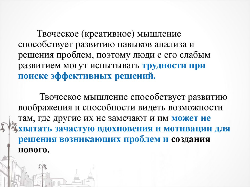 Твоческое (креативное) мышлениеспособствует развитию навыков анализа и