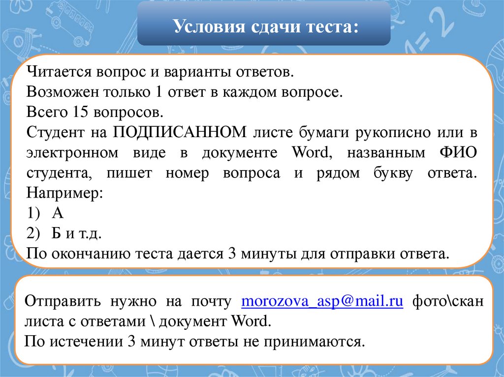 Условия сдачи теста:Читается вопрос и варианты ответов.
