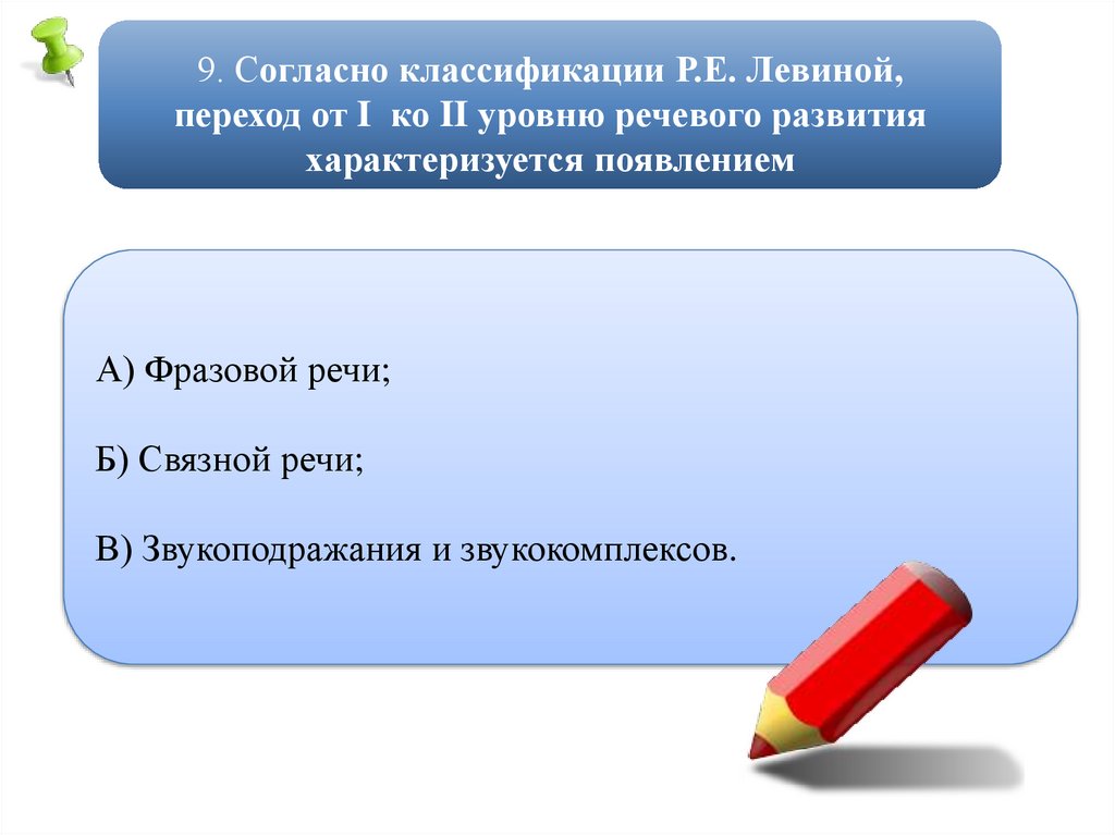9. Согласно классификации Р.Е. Левиной,переход от I ко II уровню речевого развития