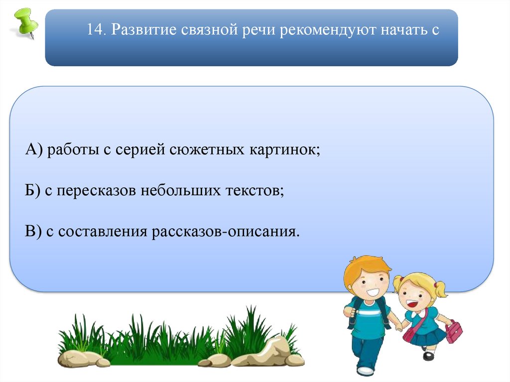 14. Развитие связной речи рекомендуют начать сА) работы с серией сюжетных картинок;