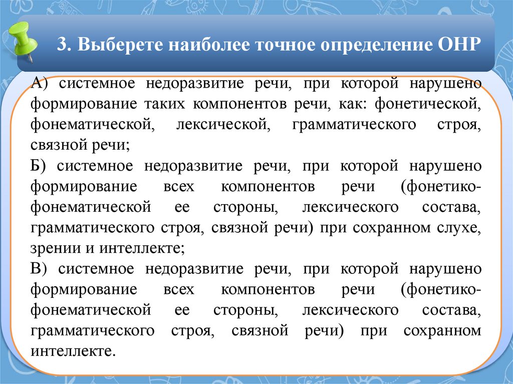 3. Выберете наиболее точное определение ОНРА) системное недоразвитие речи, при которой нарушено