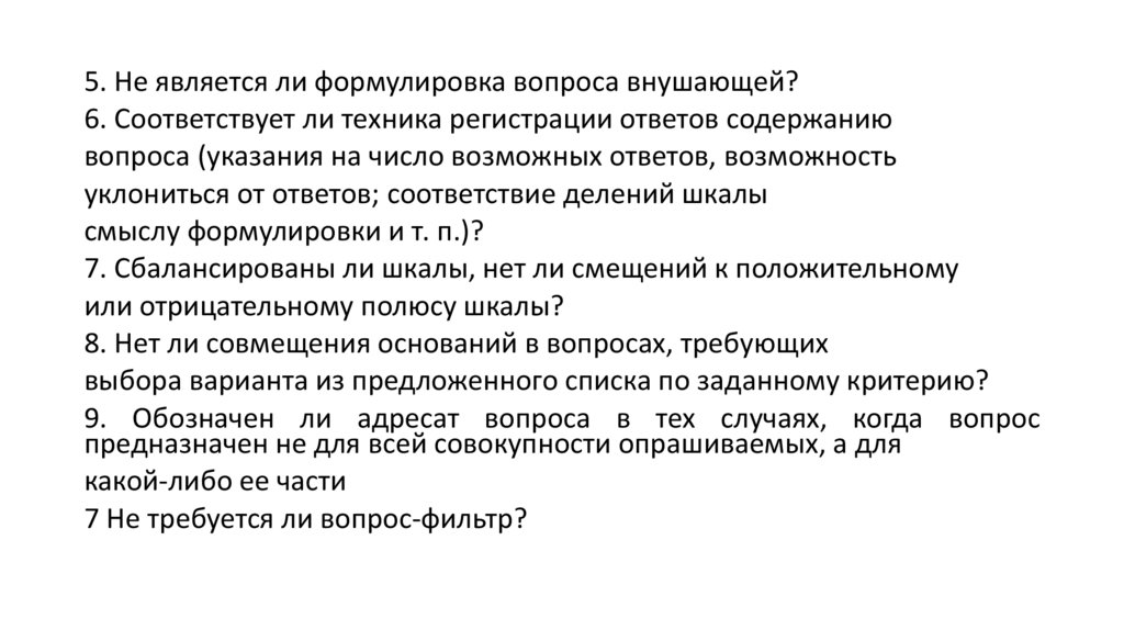 5. Не является ли формулировка вопроса внушающей?6. Соответствует ли техника регистрации ответов содержанию