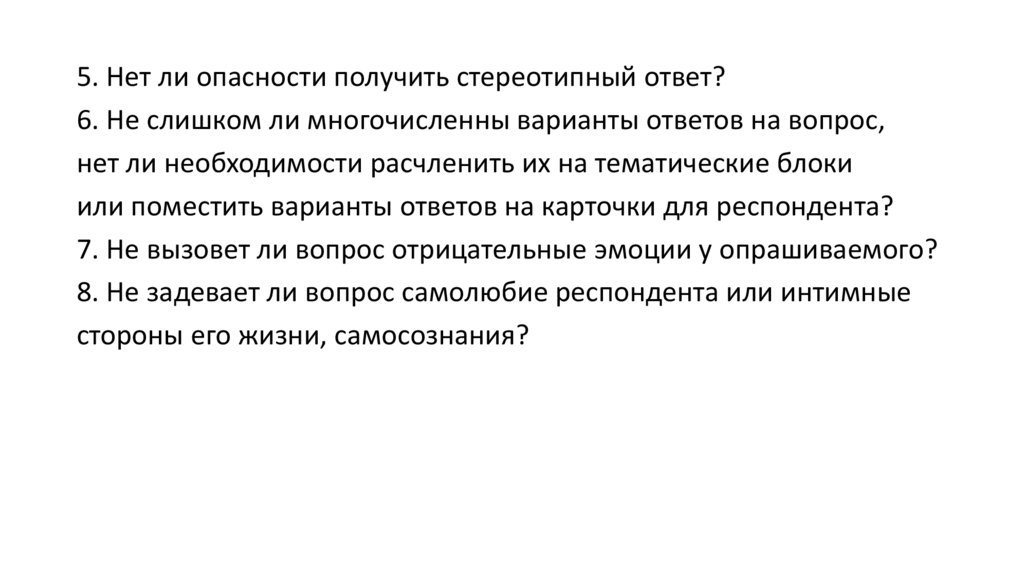 5. Нет ли опасности получить стереотипный ответ?6. Не слишком ли многочисленны варианты ответов на вопрос,