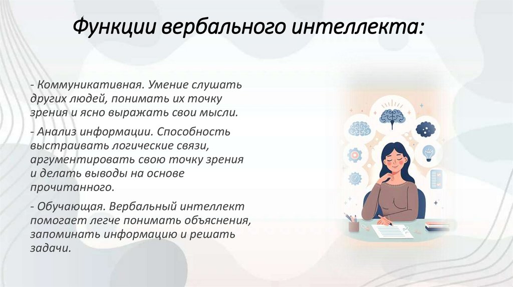 Функции вербального интеллекта:- Коммуникативная. Умение слушать