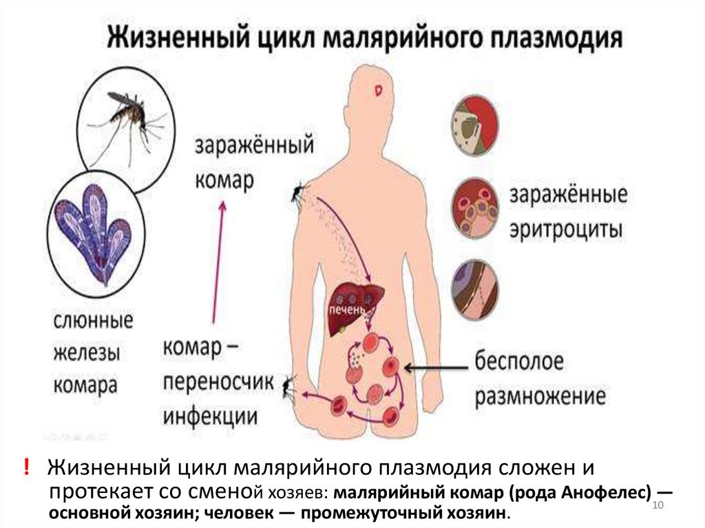 ! Жизненный цикл малярийного плазмодия сложен ипротекает со сменой хозяев: малярийный комар (рода Анофелес)10—