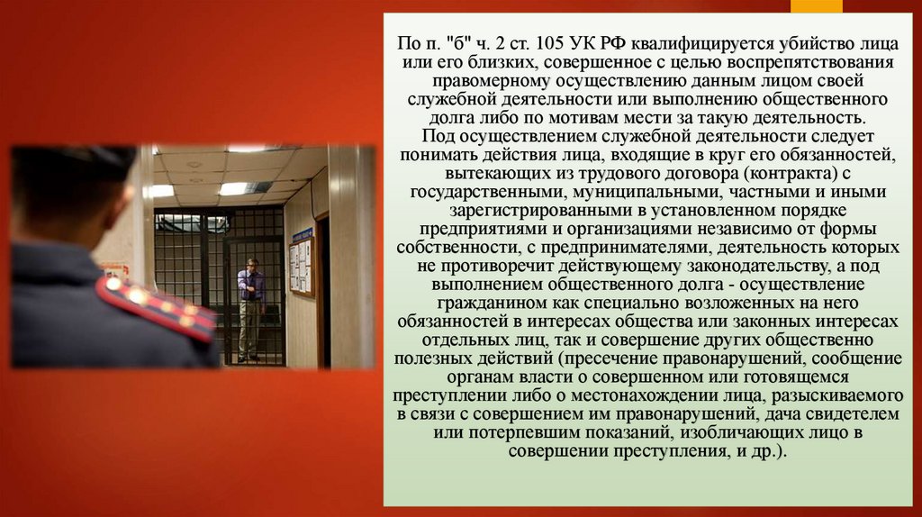 По п. "б" ч. 2 ст. 105 УК РФ квалифицируется убийство лицаили его близких, совершенное с целью воспрепятствования