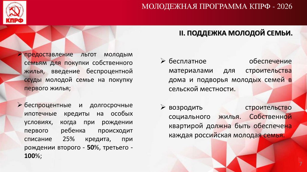 МОЛОДЕЖНАЯ ПРОГРАММА КПРФ - 2026II. ПОДДЕЖКА МОЛОДОЙ СЕМЬИ.