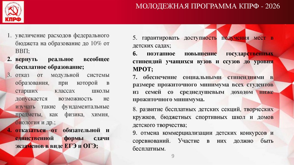 МОЛОДЕЖНАЯ ПРОГРАММА КПРФ - 20261. увеличение расходов федерального