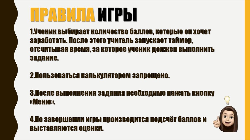 ПРАВИЛА ИГРЫ1.Ученик выбирает количество баллов, которые он хочет