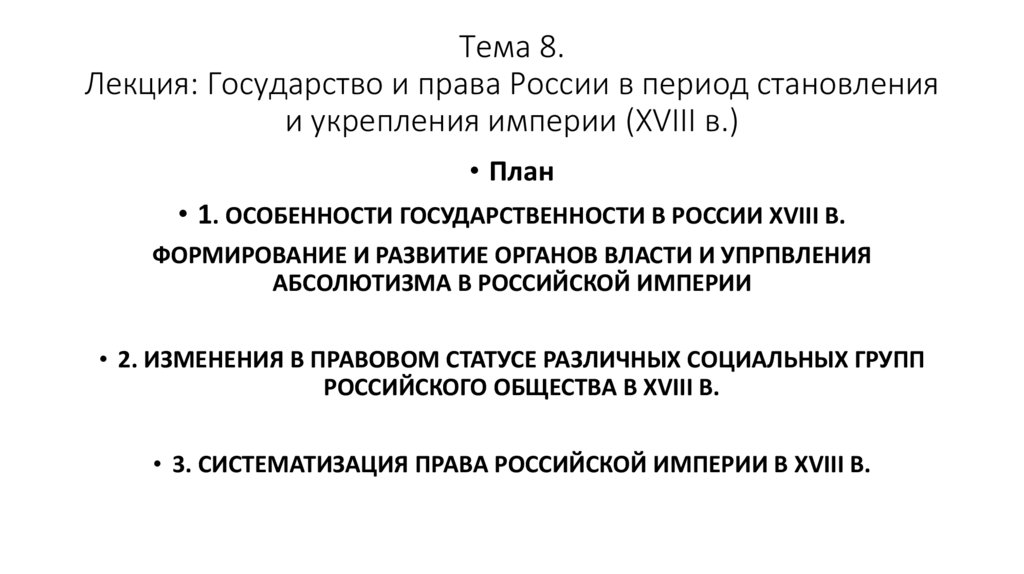 1. Тема 8. Лекция: Государство и права России в период становления и укрепления империи (XVIII в.)